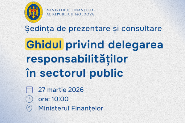 Ministerul Finanțelor anunță despre organizarea ședinței de lucru dedicate prezentării și consultării proiectului Ghidului privind delegarea împuternicirilor și responsabilităților în sectorul public, elaborat în contextul implementării unui sistem de răspundere și management delegat în administrația publică.