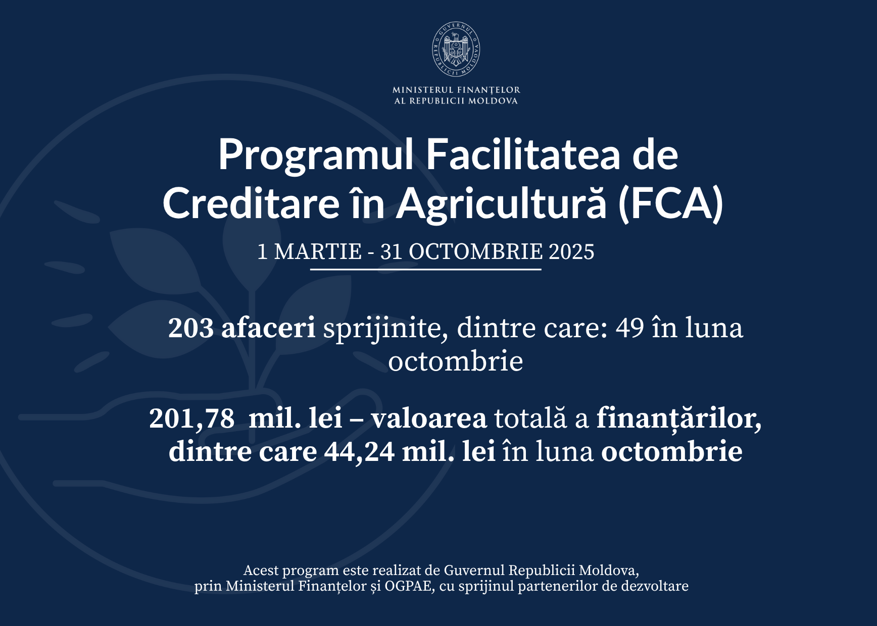 În primele 10 luni ale anului 2025, Programul Facilitatea de Creditare în Agricultură (FCA) a sprijinit 203 afaceri din sectorul agricol, dintre care 49 au fost finanțate în luna octombrie. Aceste investiții contribuie la modernizarea proceselor agricole, creșterea valorii adăugate a producției autohtone și dezvoltarea lanțului agroalimentar din mediul rural. Prin FCA, antreprenorii pot accesa credite în lei moldovenești, cu dobândă fixă de 5,1% anual.